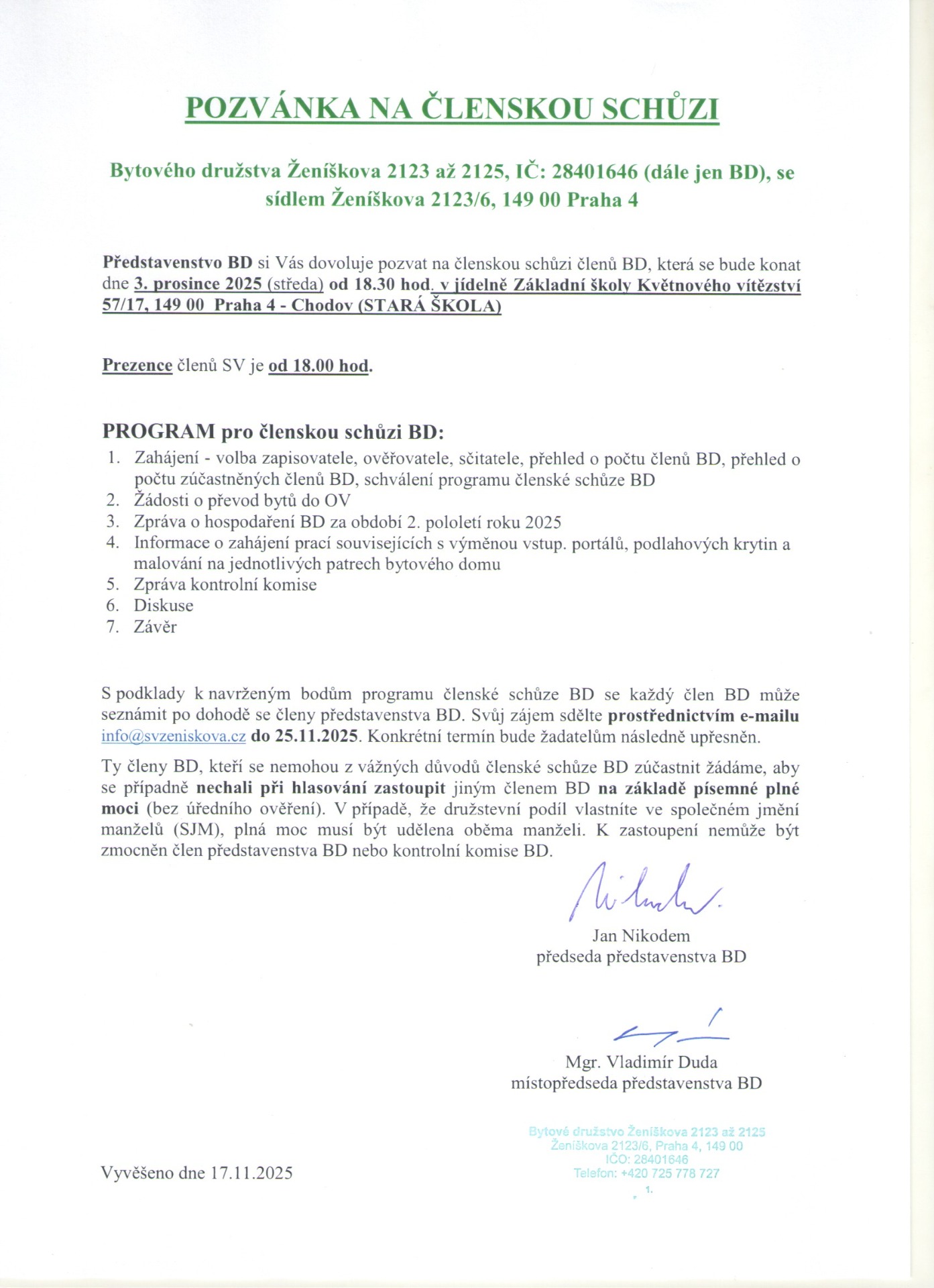 Pozvánky na schůzi BD dne 3.prosince 2025.